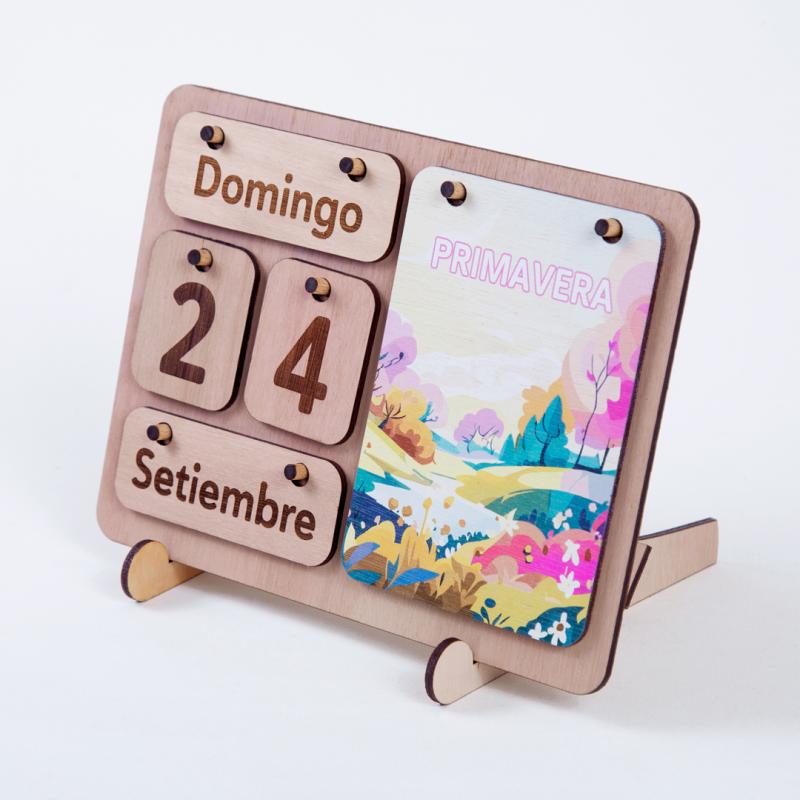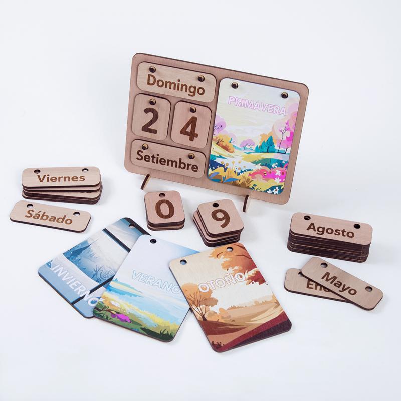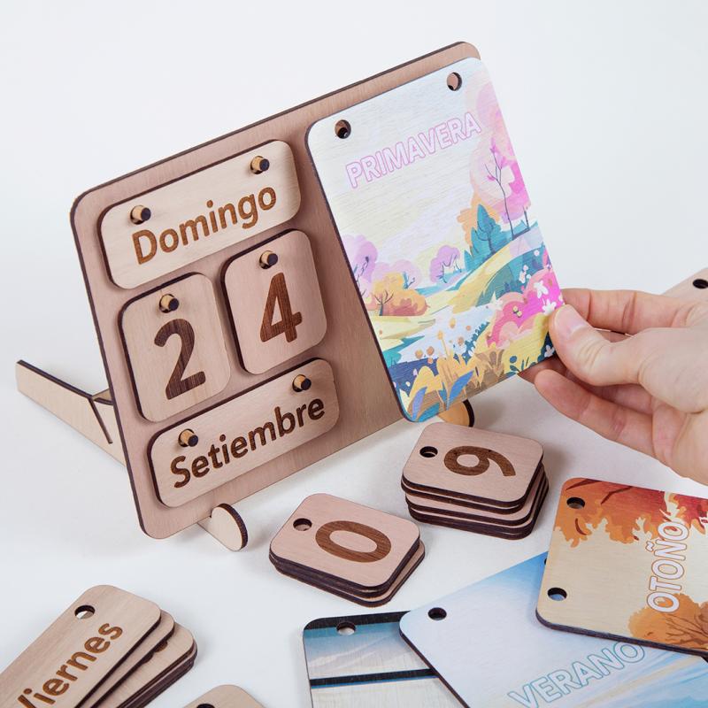 Este calendario de madera ayuda a los niños a aprender fechas, números, días, meses y estaciones. Es una excelente manera de establecer una rutina en la que todas las mañanas se puedan identificar cada uno de los ítems. El calendario incluye: El tablero y su soporte, 4 tarjetas con las estaciones, 12 tarjetas con los meses, 7 tarjetas con los días y 13 tarjetas con números. Se recomienda su uso a partir de los 3 años.