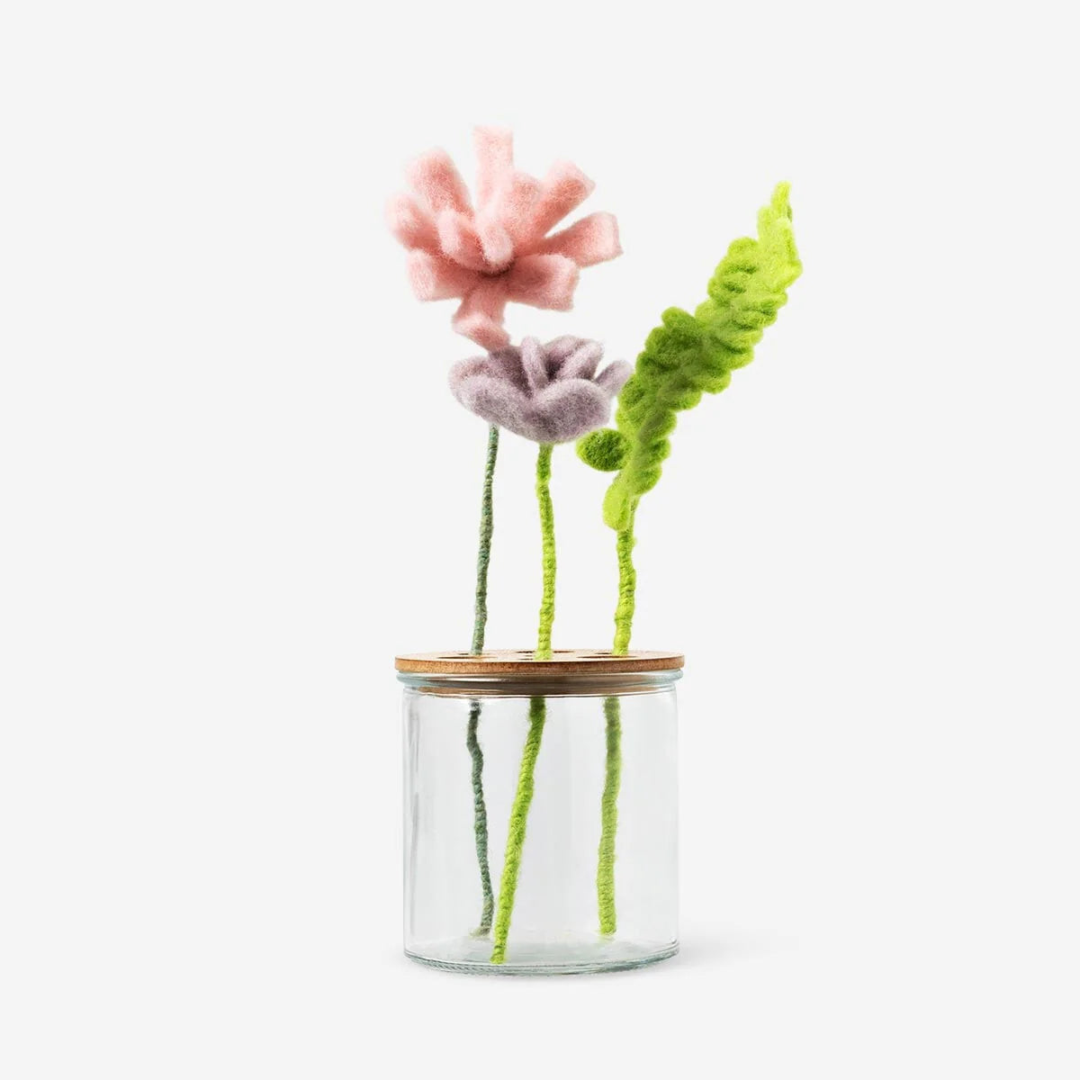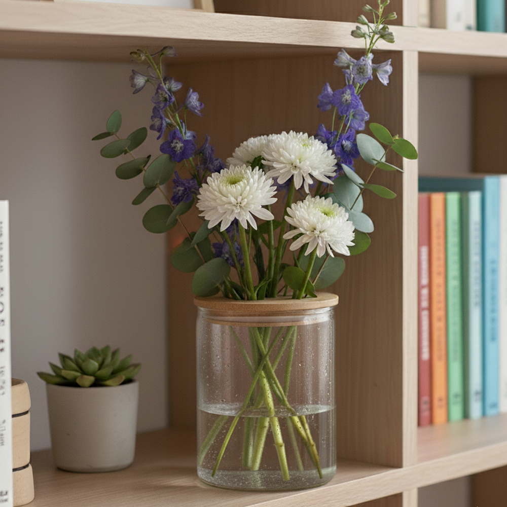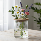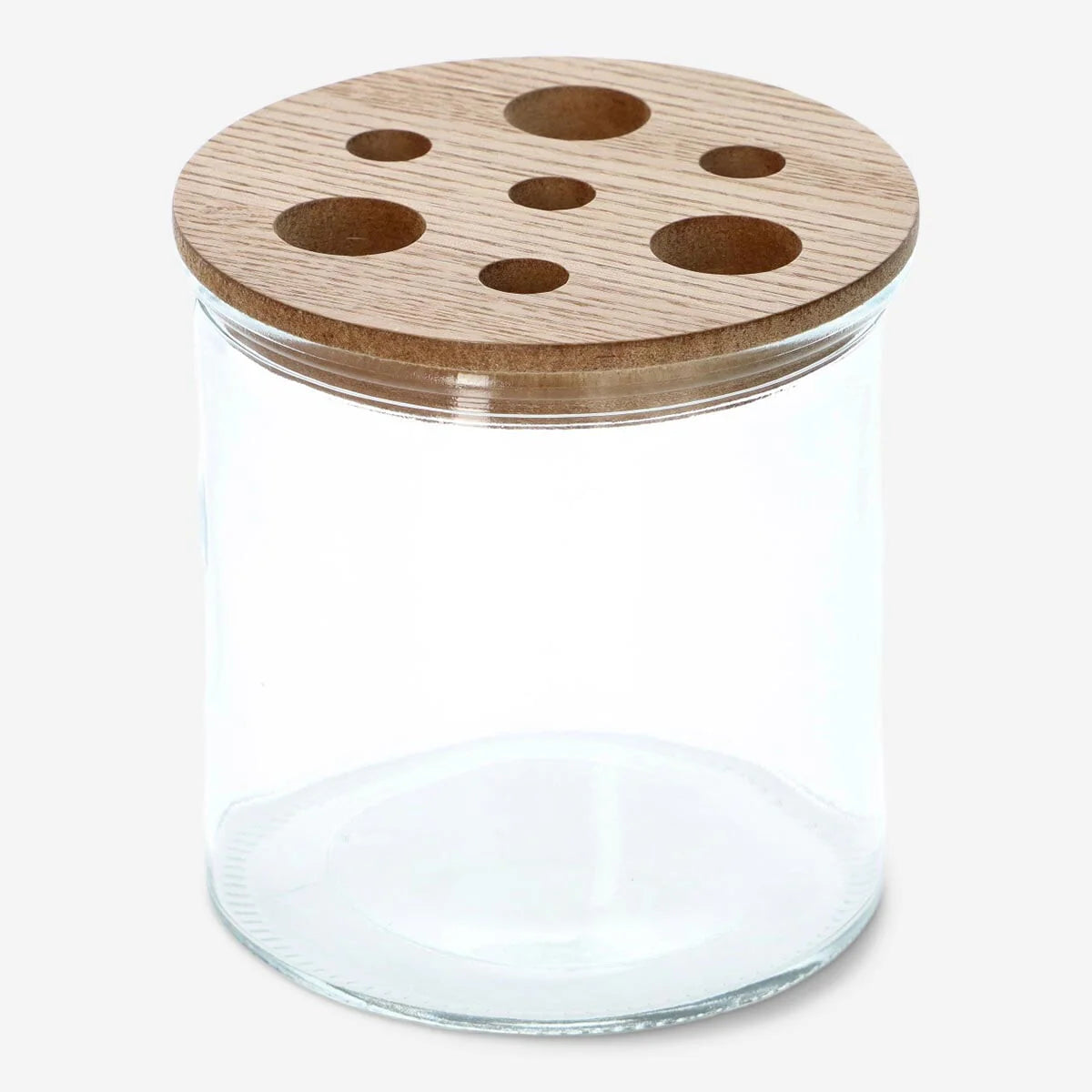 Diseñado para combinar estilo y funcionalidad, este florero cuenta con una tapa de madera, que incluye perforaciones para separar las flores y crear arreglos únicos y prolijos.