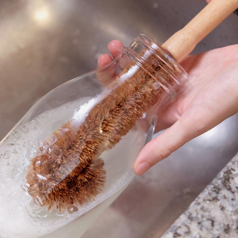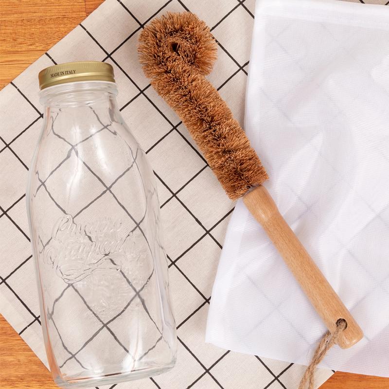 Materiales: Bolsa para filtrar leches 100% poliéster / Botella: Vidrio / Fibra de coco y madera