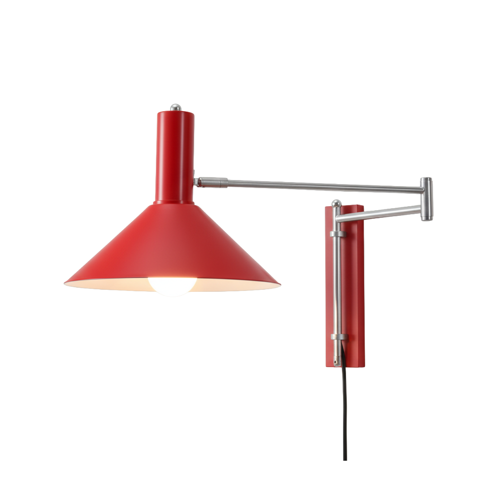 Pantalla de hierro en tono rojo que concentra la luz hacia abajo, ideal para ambientes cálidos y acogedores.