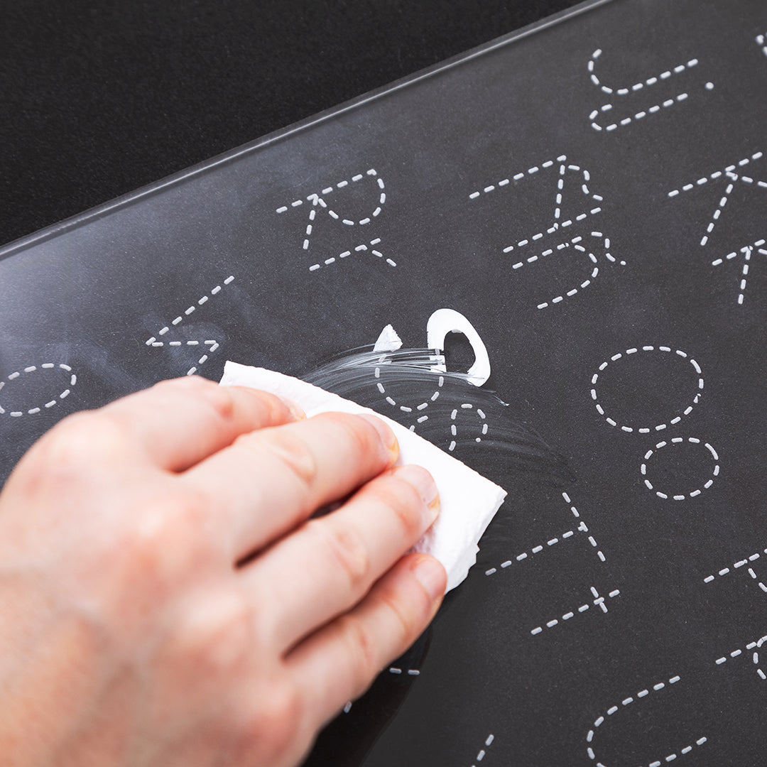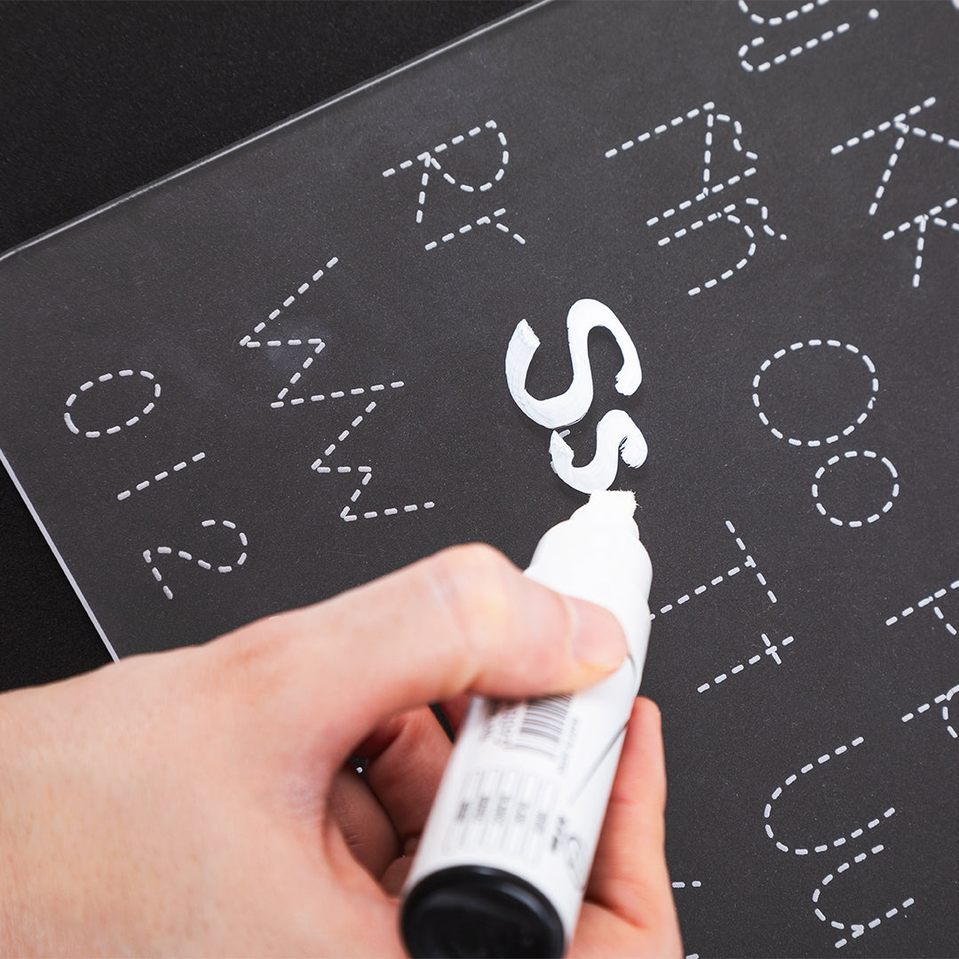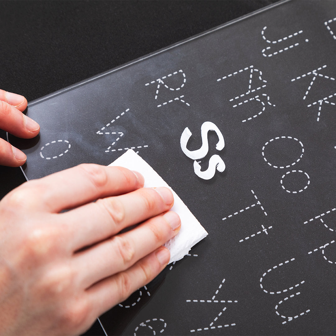 Nuestras tablas de acrílico están grabadas en la parte trasera, dejando la superficie frontal lisa y lista para que la tracen una y otra vez