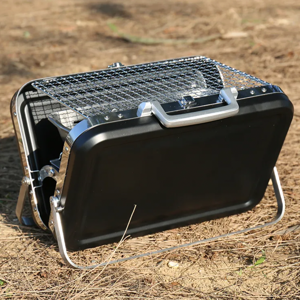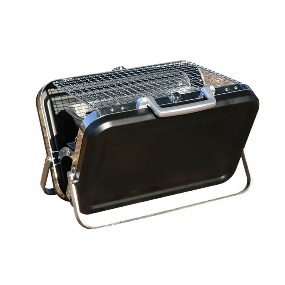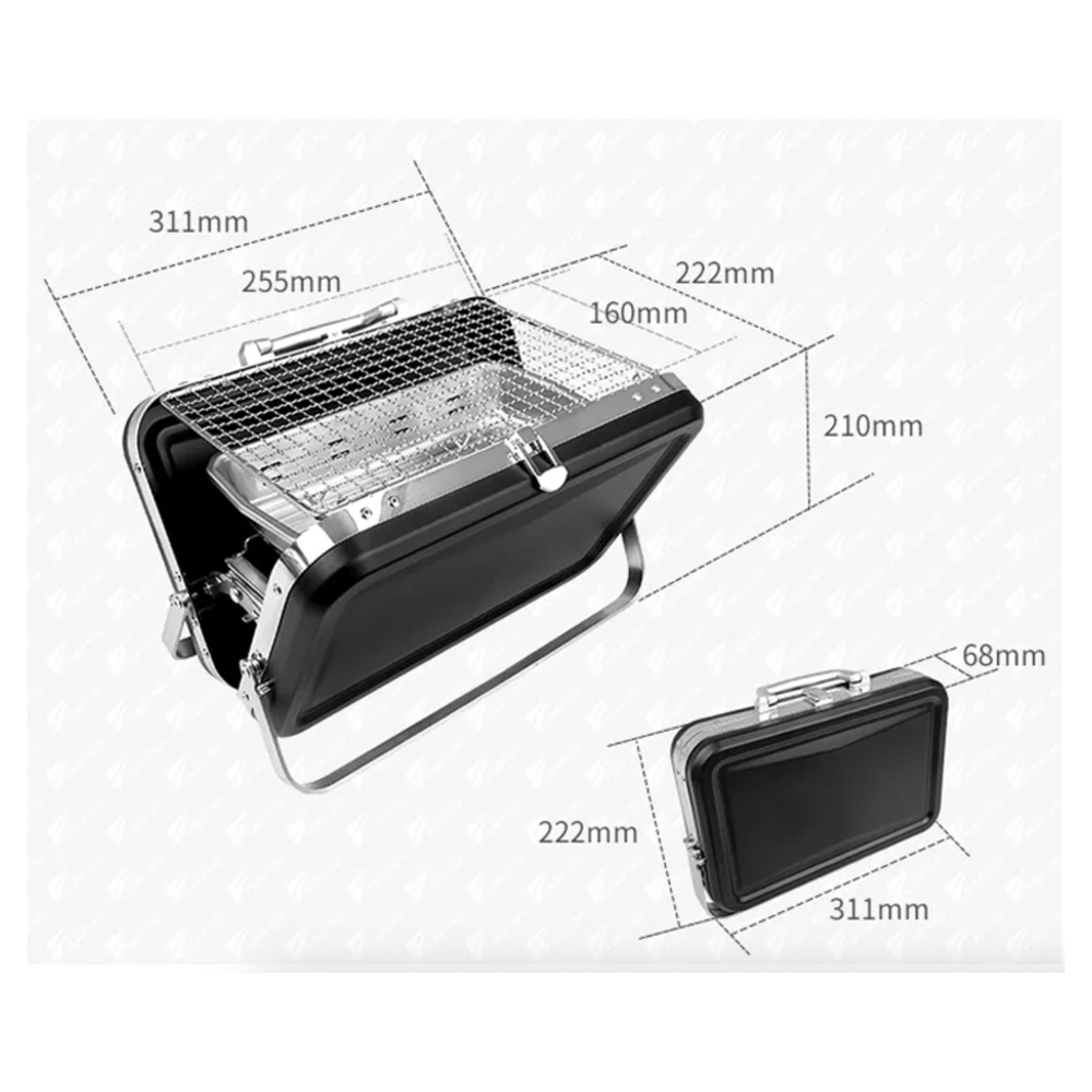 Su diseño tipo valija es compacto y resistente, con manija integrada para transportarla cómodamente. Se arma y desarma en minutos, y su bandeja de carbón con orificios de ventilación asegura una cocción pareja.